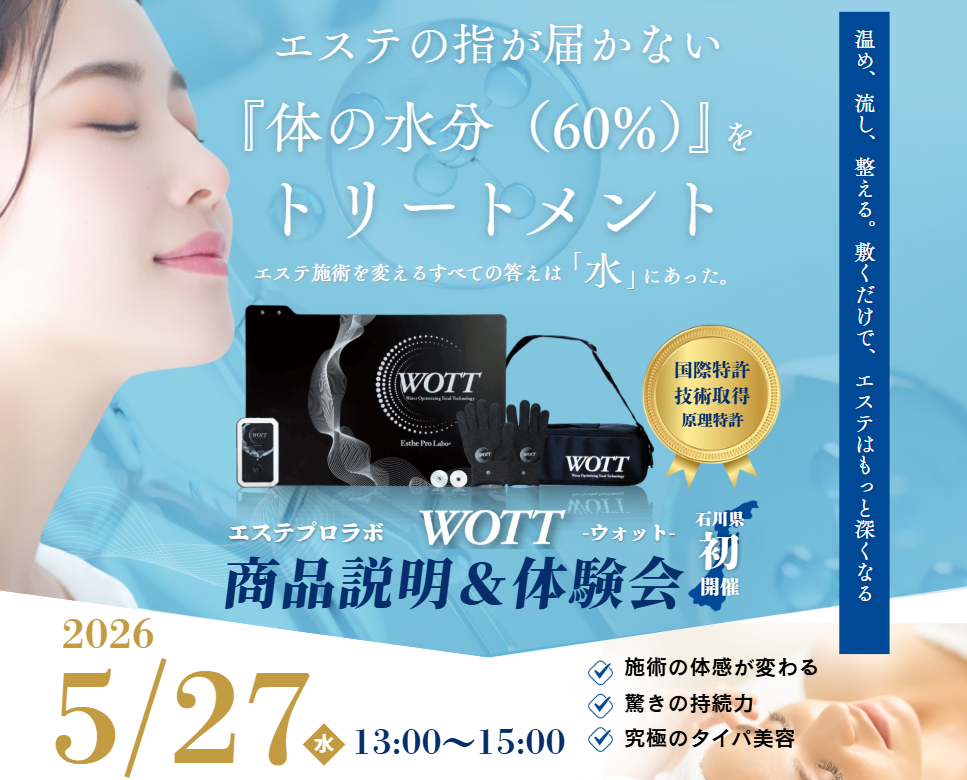 エステの指が届かない『体の水分(60%)』をトリートメントエステプロラボ「WOTT-ウォット-」商品説明&体験会 いつも弊社をご愛顧いただき、ありがとうございます。 5月27日(水)国際ビジネス学院金沢キャンパスにて、エ […]