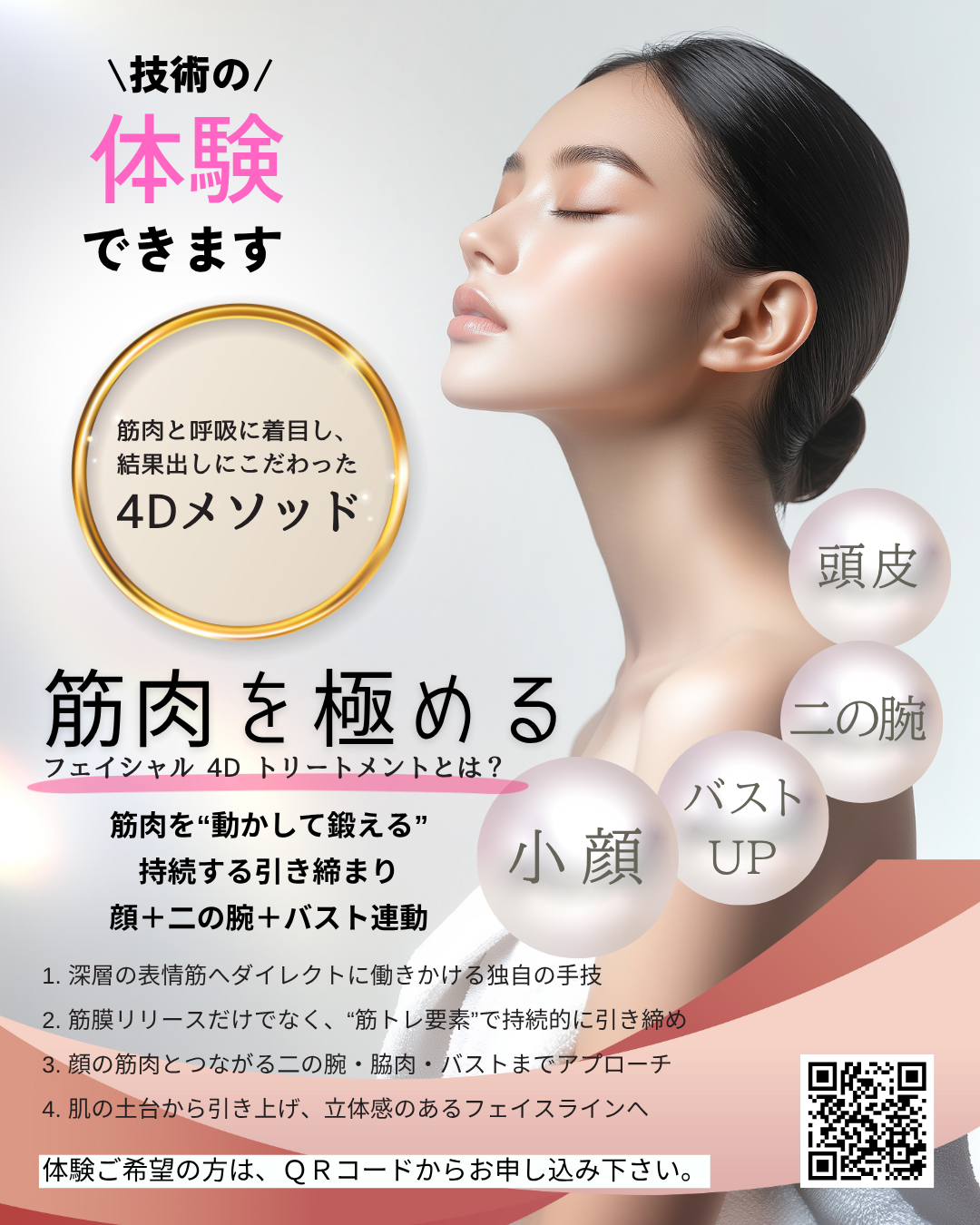 一時的ではない、「持続する美しさ」を叶える独自の 4Dメソッド。選べるフェイシャル・ボディの 「4Dトリートメント」 です。 ■ フェイシャル4Dトリートメントとは? 顔の筋肉は、二の腕や胸筋、バストともつながっています […]