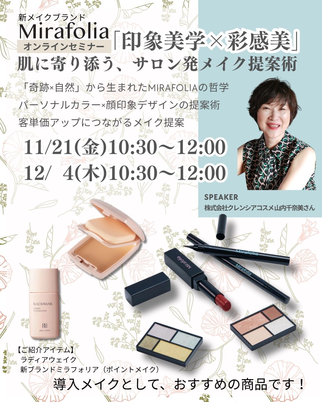 本セミナーでは、ベースメイク「ラディアウェイク」のコンセプトと商品特長、新ブランド「ミラフォリア」のポイントメイクアイテムの使い方をご紹介します。あわせて、お客様への効果的な提案方法や販売アプローチもお伝えします。 【日 […]