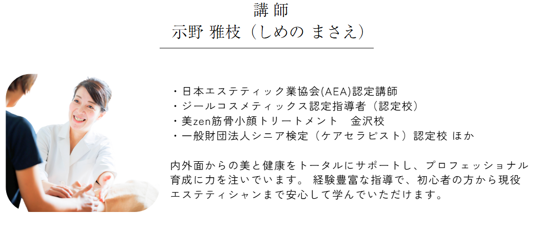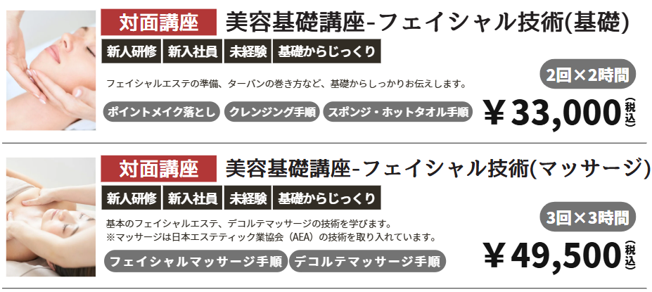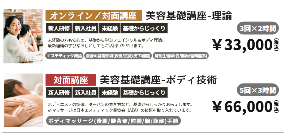 エステが初めての方、未経験からスタートする方のための基礎講座です。サロンの新人研修としてもご利用いただけます。