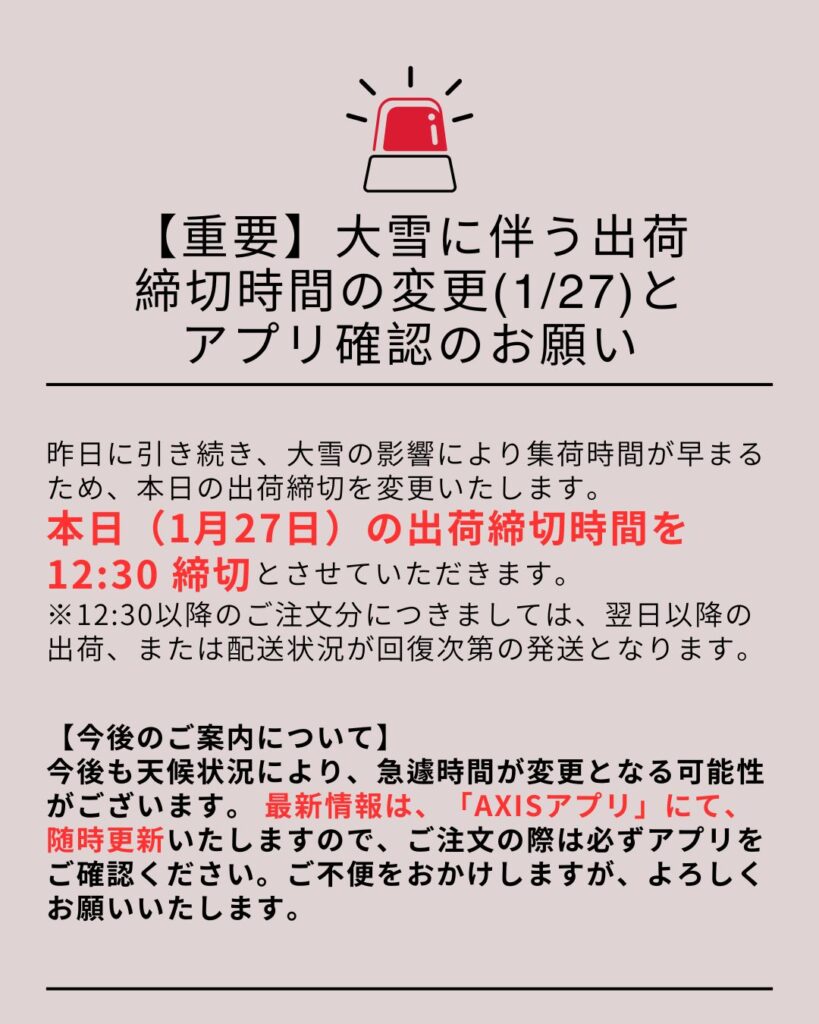 今後も降雪状況や道路事情により、予告なく出荷締切時間や配送スケジュールが変更となる可能性がございます。